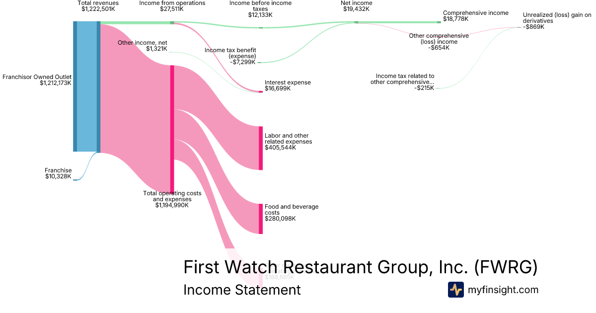 For the year ending 2025-12-28, FWRG made $1,222,501K in revenue. $18,778K in net income. Net profit margin of 1.54%.