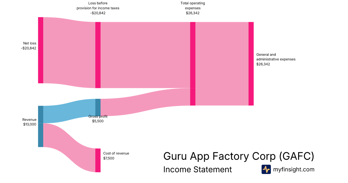 For the quarter ending 2025-10-31, GAFC made $13,000 in revenue. -$20,842 in net income. Net profit margin of -160.32%.