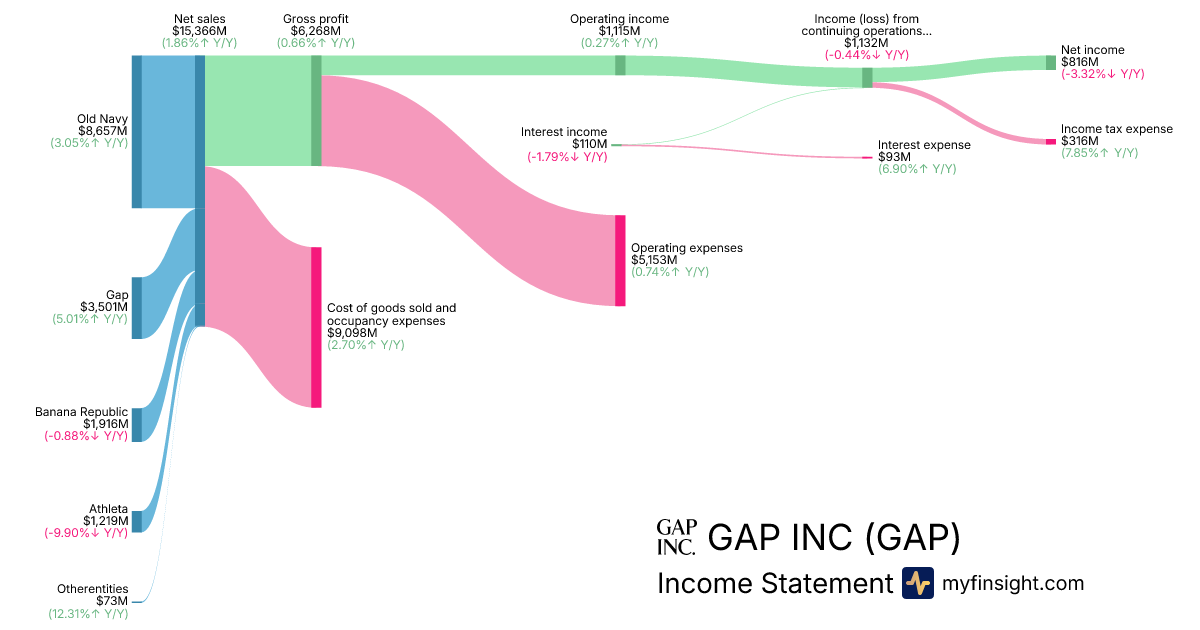 For the year ending 2026-01-31, GAP made $15,366M in revenue. $816M in net income. Net profit margin of 5.31%.