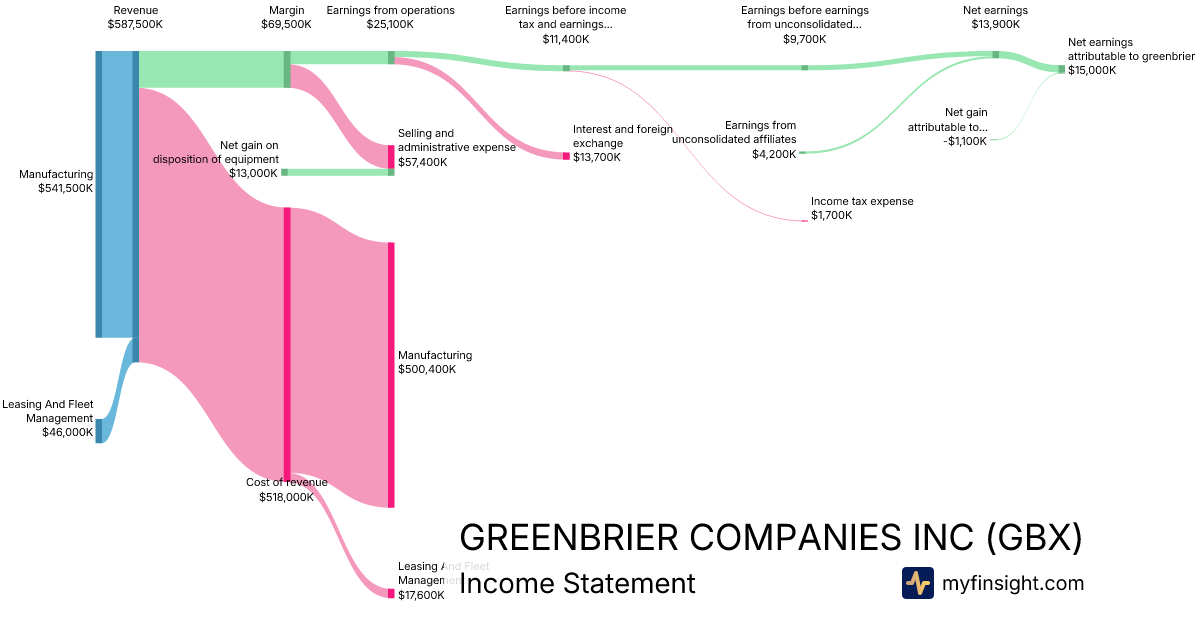 For the quarter ending 2026-02-28, GBX made $587,500K in revenue. $15,000K in net income. Net profit margin of 2.55%.
