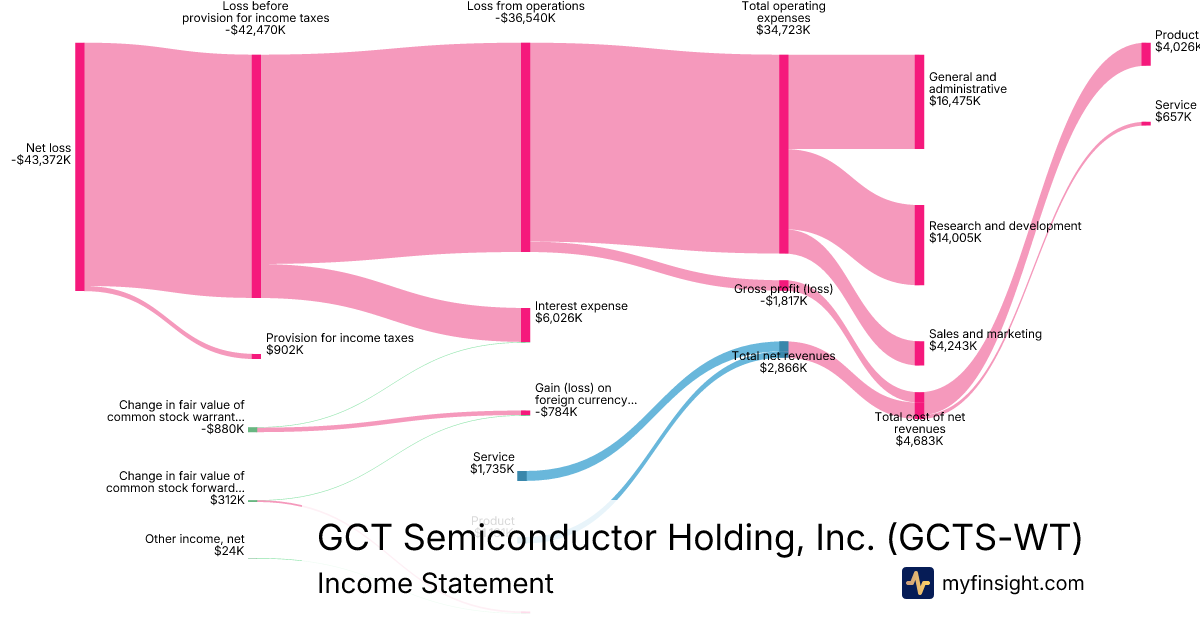 For the year ending 2025-12-31, GCTS-WT made $2,866K in revenue. -$43,372K in net income. Net profit margin of -1513.33%.