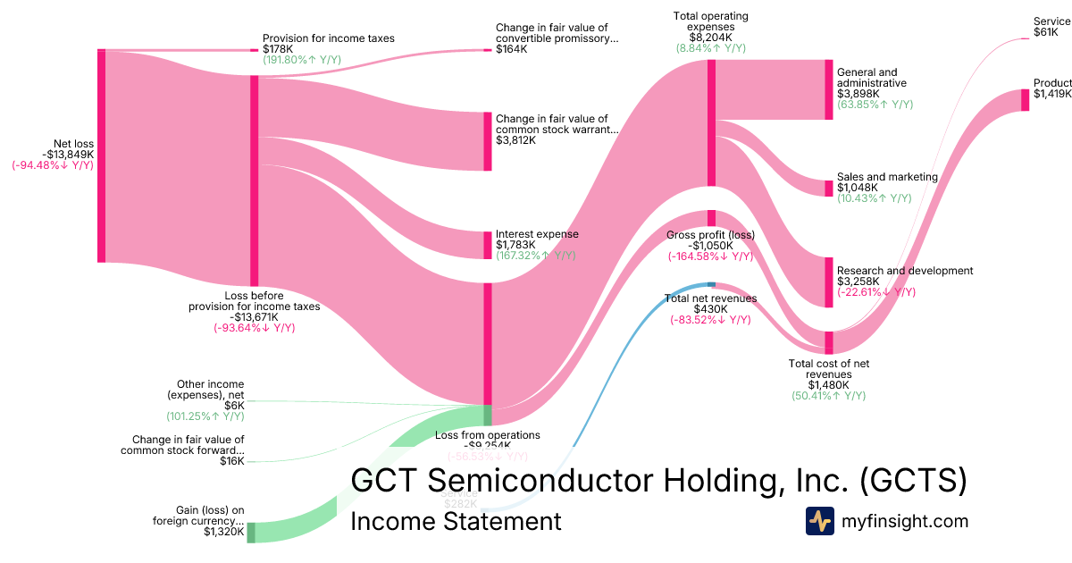For the quarter ending 2025-09-30, GCTS made $430,000 in revenue. -$13,849,000 in net income. Net profit margin of -3220.70%.