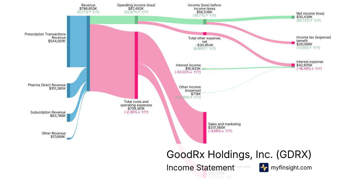 For the year ending 2025-12-31, GDRX made $796,853K in revenue. $30,439K in net income. Net profit margin of 3.82%.