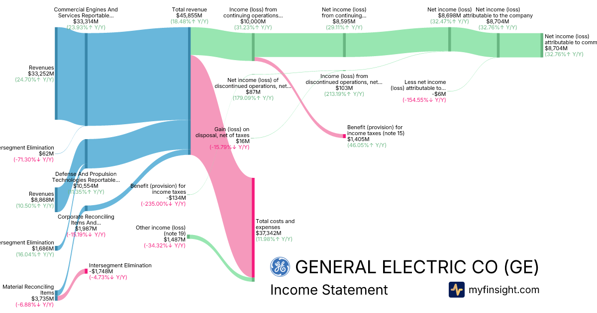 For the year ending 2025-12-31, GE made $45,855M in revenue. $8,704M in net income. Net profit margin of 18.98%.