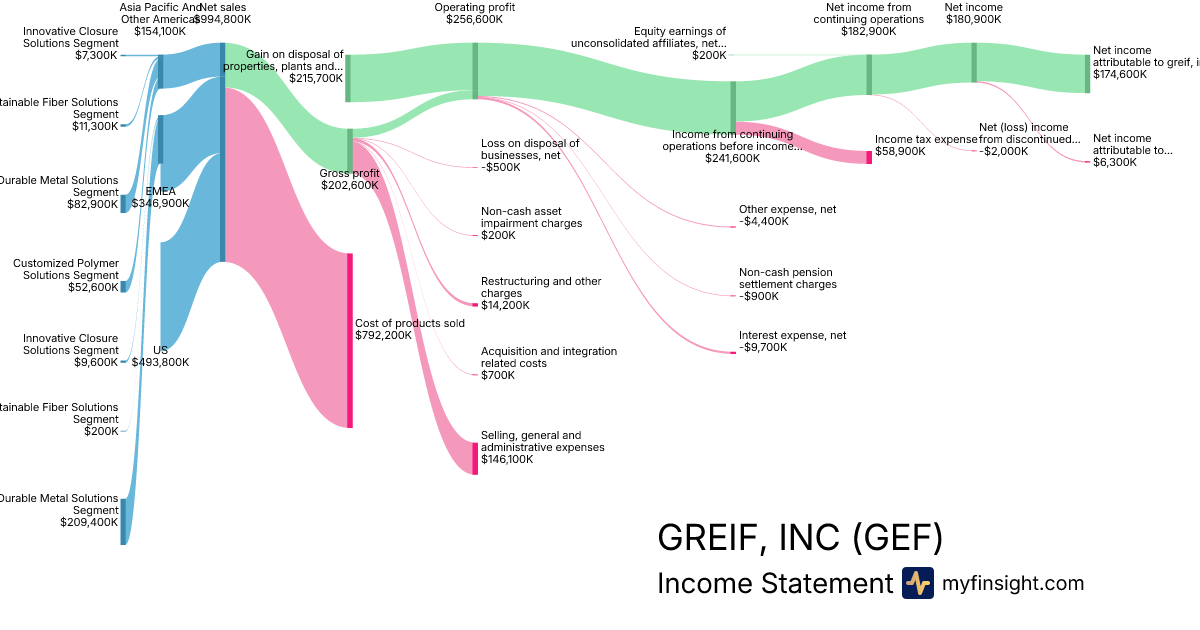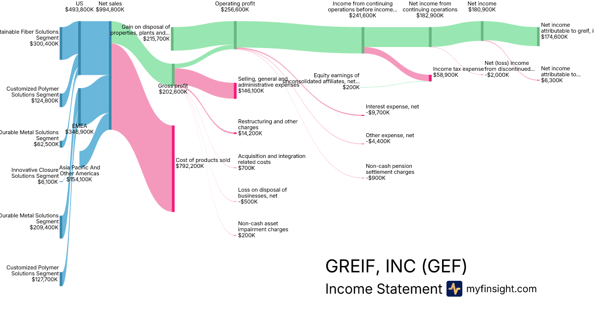 For the quarter ending 2025-12-31, GEF made $994,800K in revenue. $174,600K in net income. Net profit margin of 17.55%.