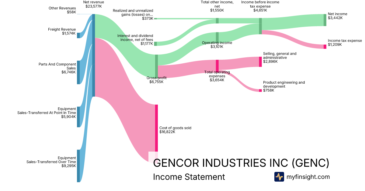 For the quarter ending 2025-12-31, GENC made $23,577K in revenue. $3,442K in net income. Net profit margin of 14.60%.