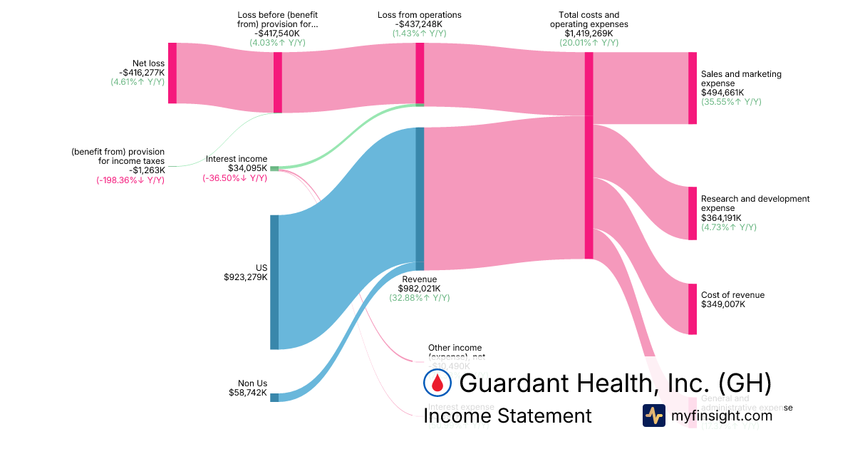 For the year ending 2025-12-31, GH made $982,021K in revenue. -$416,277K in net income. Net profit margin of -42.39%.