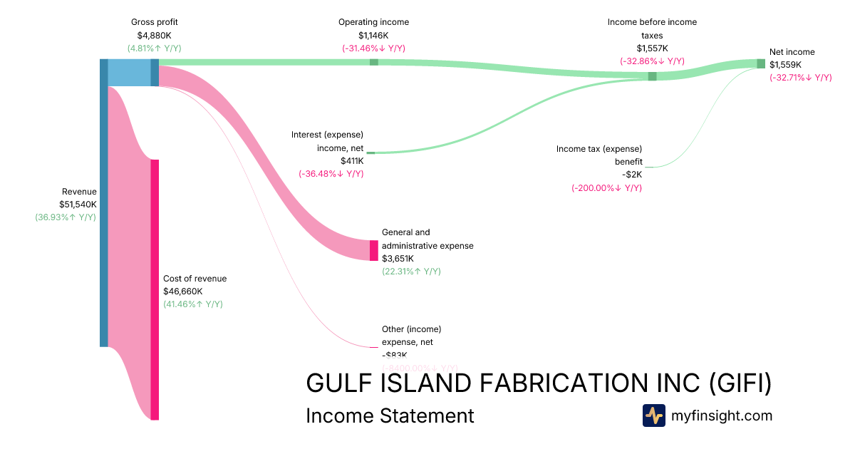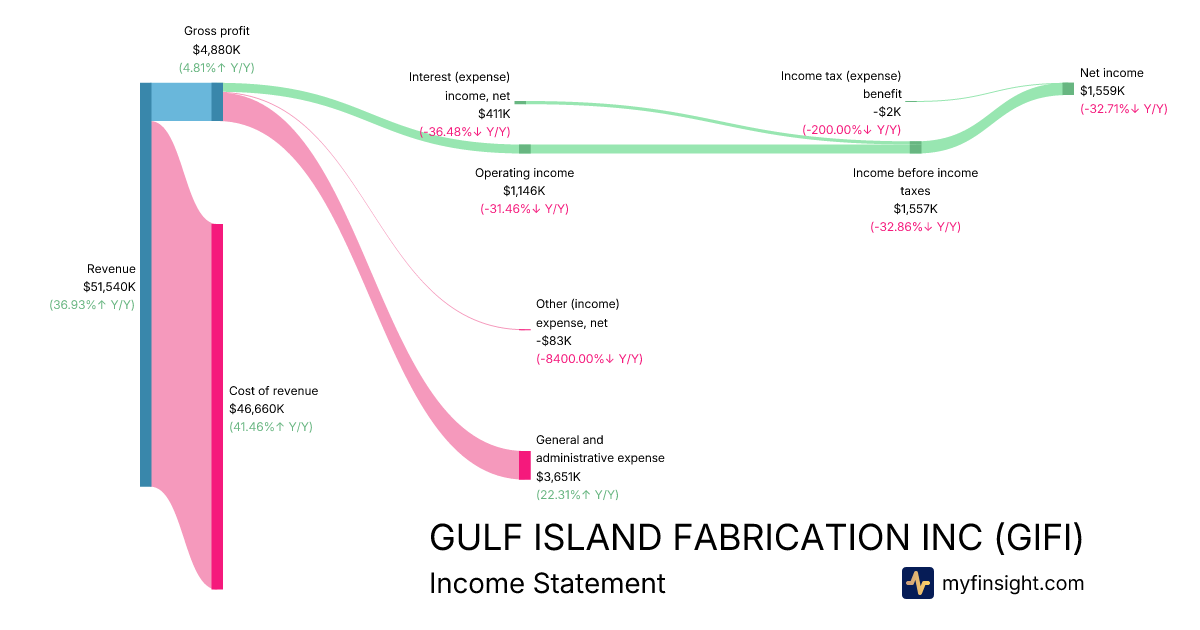 For the quarter ending 2025-09-30, GIFI made $51,540K in revenue. $1,559K in net income. Net profit margin of 3.02%.