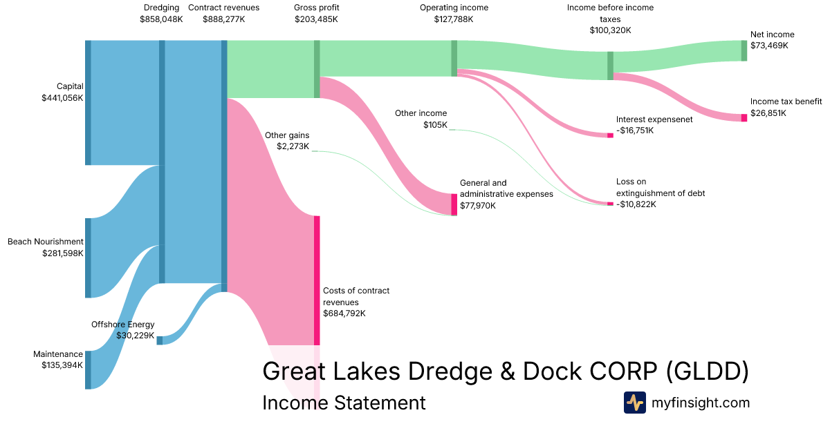 For the year ending 2025-12-31, GLDD made $888,277K in revenue. $73,469K in net income. Net profit margin of 8.27%.