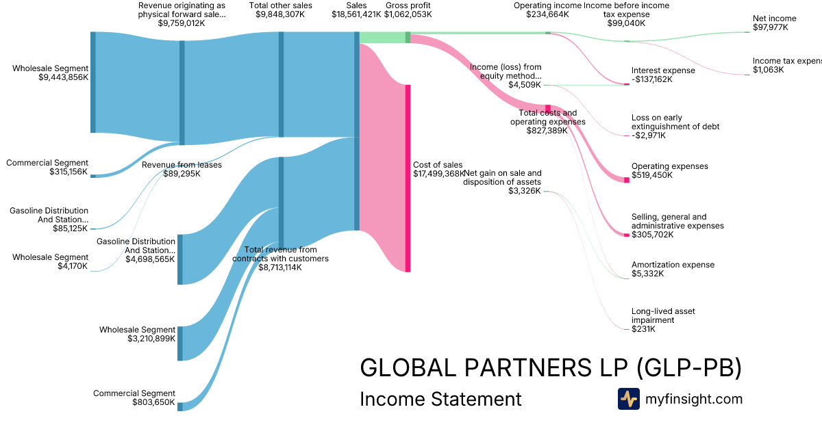 For the year ending 2025-12-31, GLP-PB made $18,561,421K in revenue. $97,977K in net income. Net profit margin of 0.53%.