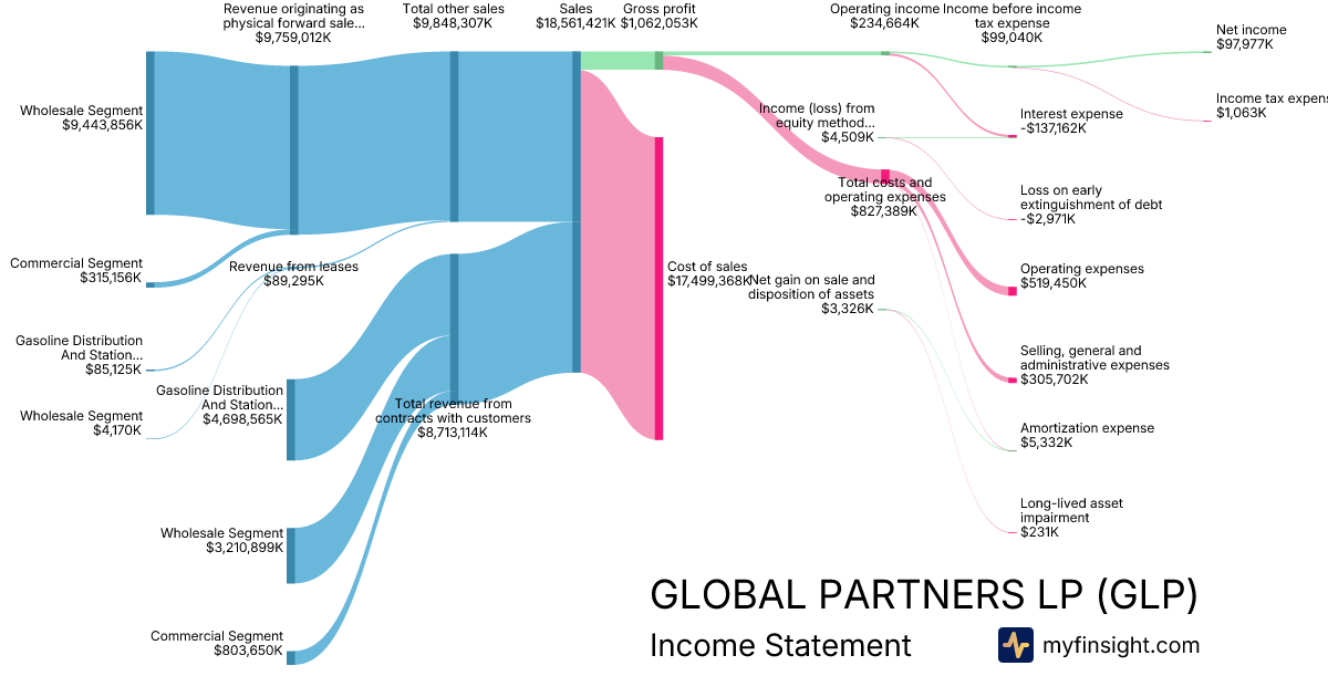 For the year ending 2025-12-31, GLP made $18,561,421K in revenue. $97,977K in net income. Net profit margin of 0.53%.