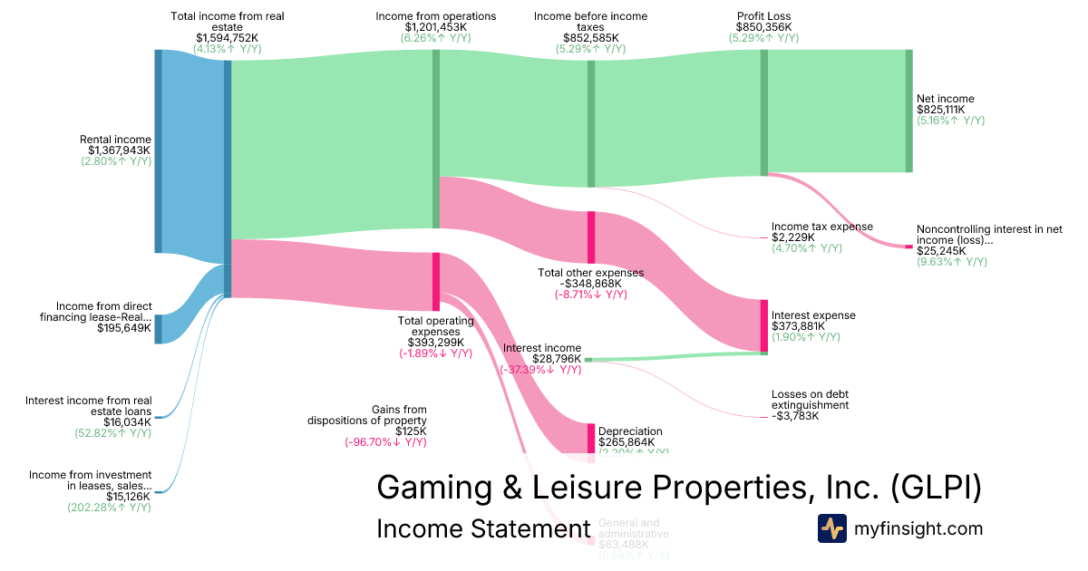 For the year ending 2025-12-31, GLPI made $1,594,752K in revenue. $825,111K in net income. Net profit margin of 51.74%.