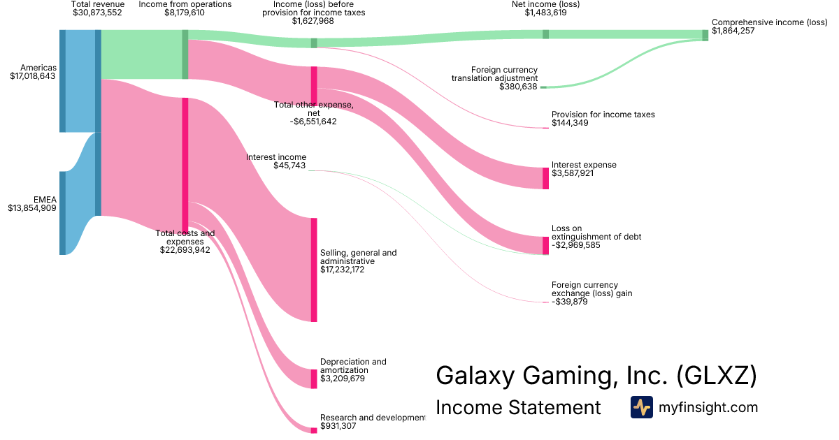 For the year ending 2025-12-31, GLXZ made $30,873,552 in revenue. $1,864,257 in net income. Net profit margin of 6.04%.