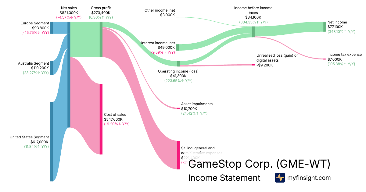 For the quarter ending 2025-11-01, GME-WT made $821,000,000 in revenue. $77,100,000 in net income. Net profit margin of 9.39%.