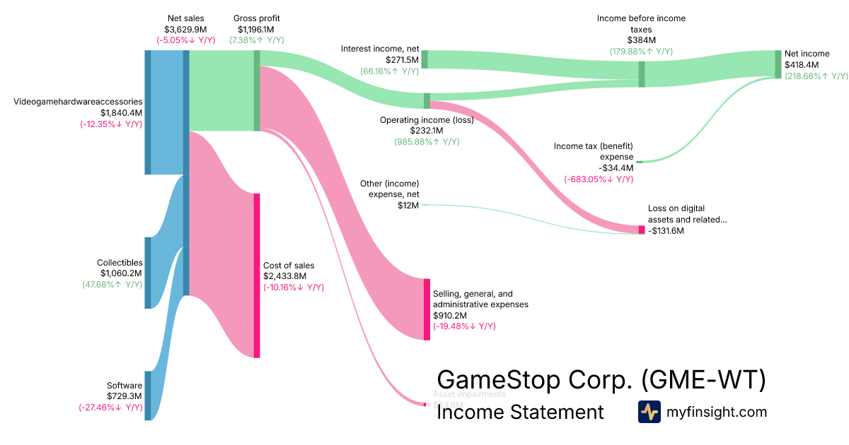 For the year ending 2026-01-31, GME-WT made $3,629.9M in revenue. $418.4M in net income. Net profit margin of 11.53%.