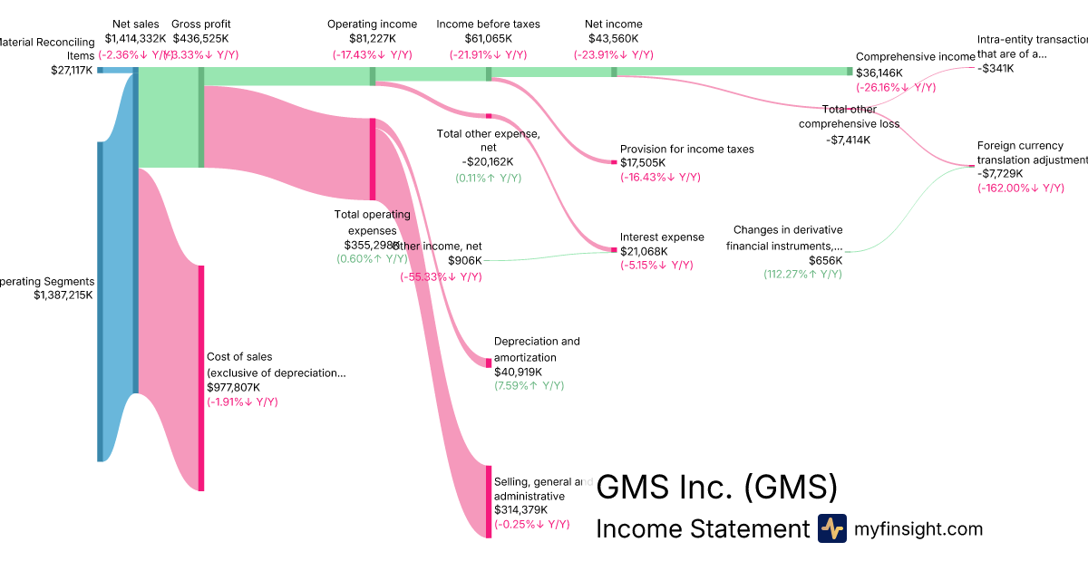 For the quarter ending 2025-07-31, GMS made $1,414,332K in revenue. $36,146K in net income. Net profit margin of 2.56%.
