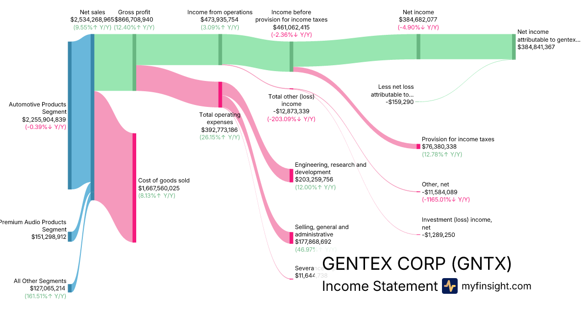 For the year ending 2025-12-31, GNTX made $2,534,268,965 in revenue. $384,841,367 in net income. Net profit margin of 15.19%.