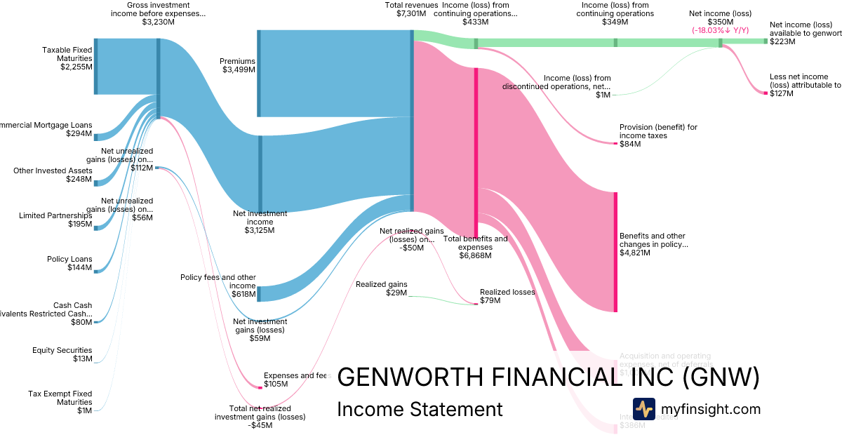 For the year ending 2025-12-31, GNW made $7,301M in revenue. $223M in net income. Net profit margin of 3.05%.