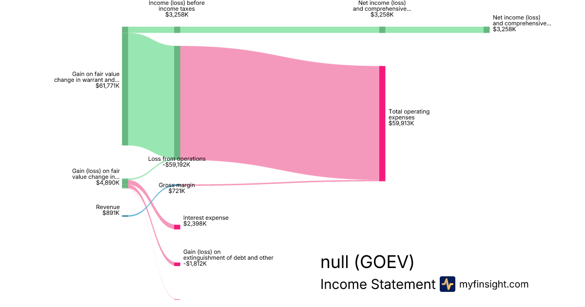 For the quarter ending 2024-09-30, GOEV made $891K in revenue. $3,258K in net income. Net profit margin of 365.66%.