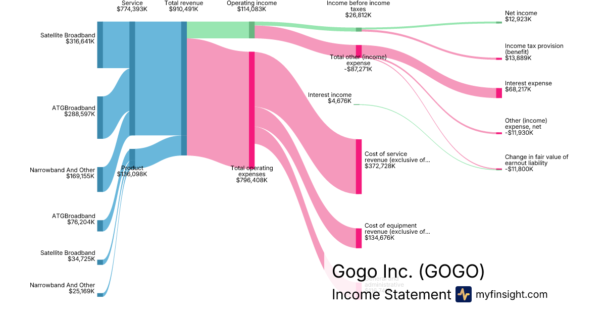 For the year ending 2025-12-31, GOGO made $910,491K in revenue. $12,923K in net income. Net profit margin of 1.42%.