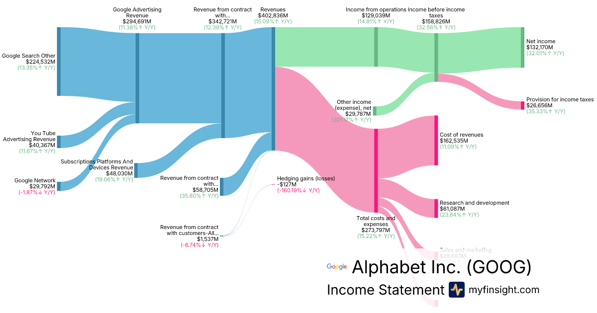 For the year ending 2025-12-31, GOOG made $402,836M in revenue. $132,170M in net income. Net profit margin of 32.81%.