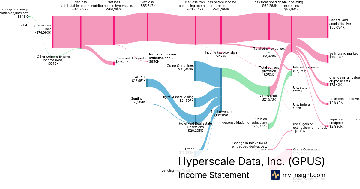 For the year ending 2025-12-31, GPUS made $102,112K in revenue. -$74,090K in net income. Net profit margin of -72.56%.