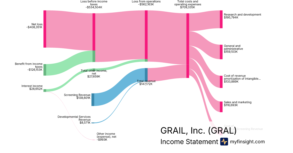 For the year ending 2025-12-31, GRAL made $147,172K in revenue. -$408,351K in net income. Net profit margin of -277.47%.