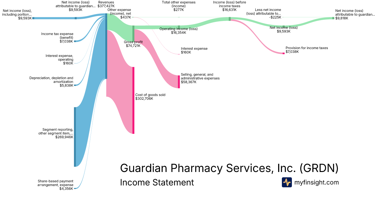 For the quarter ending 2025-09-30, GRDN made $377,427K in revenue. $9,818K in net income. Net profit margin of 2.60%.