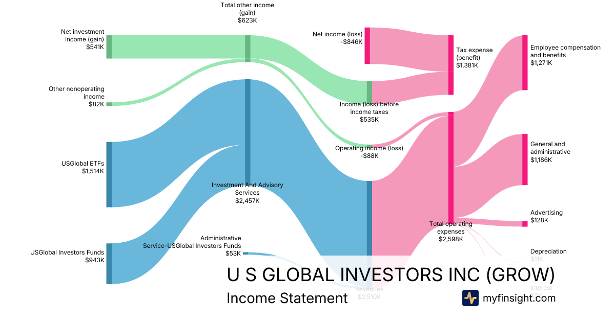 For the quarter ending 2025-12-31, GROW made $2,510K in revenue. -$846K in net income. Net profit margin of -33.71%.