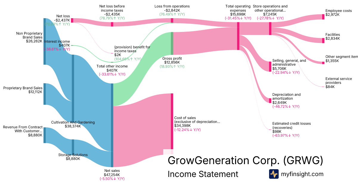 For the quarter ending 2025-09-30, GRWG made $47,254K in revenue. -$2,437K in net income. Net profit margin of -5.16%.
