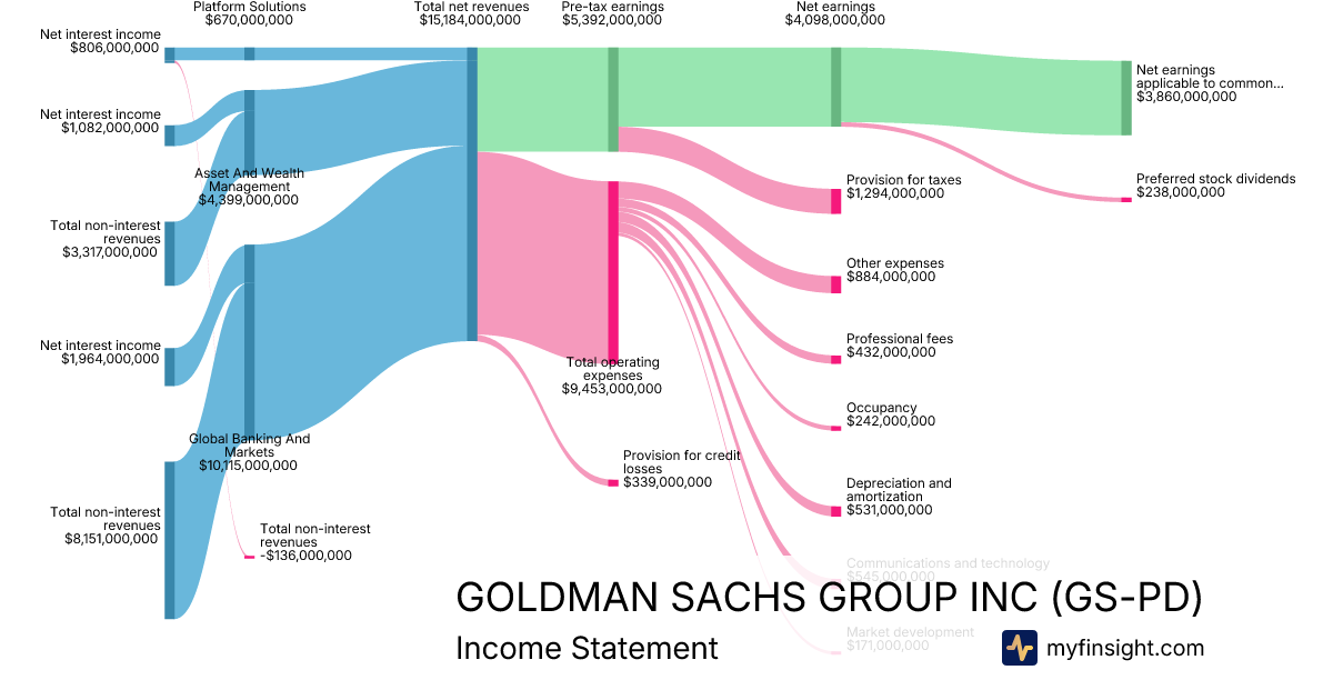 For the quarter ending 2025-09-30, GS-PD made $15,184,000,000 in revenue. $3,860,000,000 in net income. Net profit margin of 25.42%.