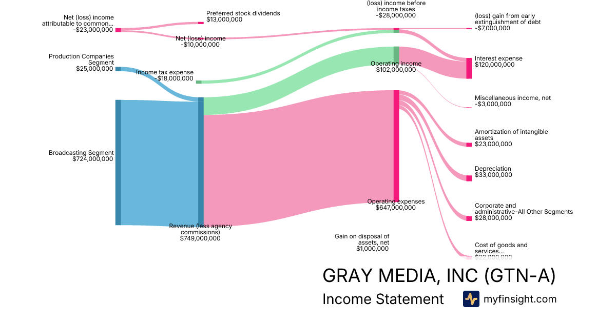 For the quarter ending 2025-09-30, GTN-A made $749,000,000 in revenue. -$23,000,000 in net income. Net profit margin of -3.07%.