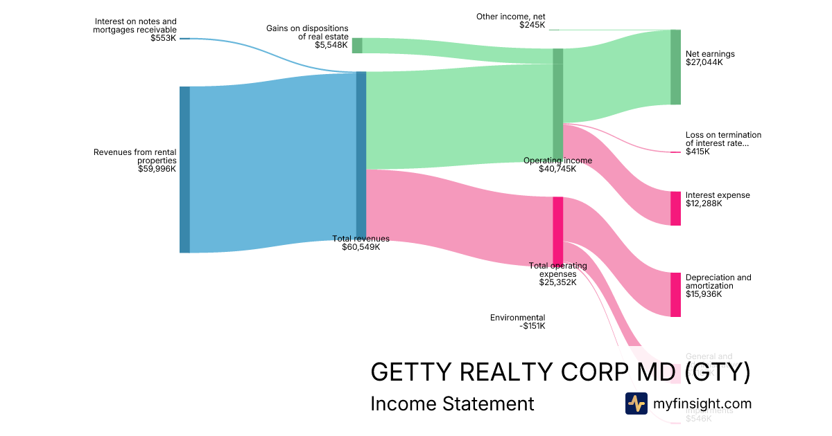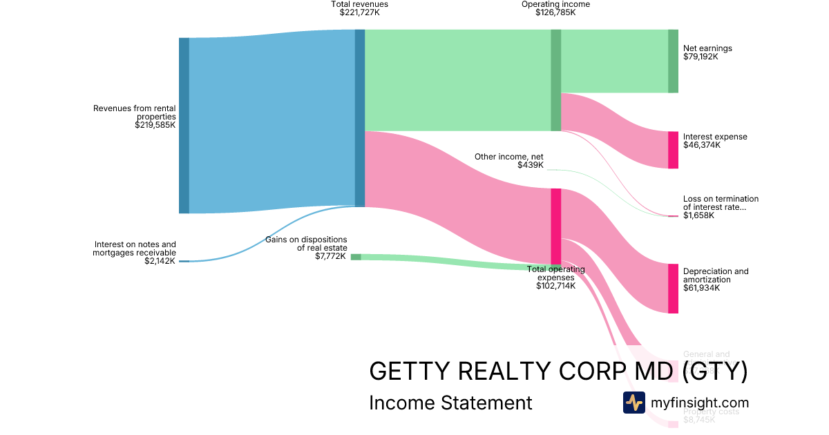 For the year ending 2025-12-31, GTY made $221,727K in revenue. $79,192K in net income. Net profit margin of 35.72%.