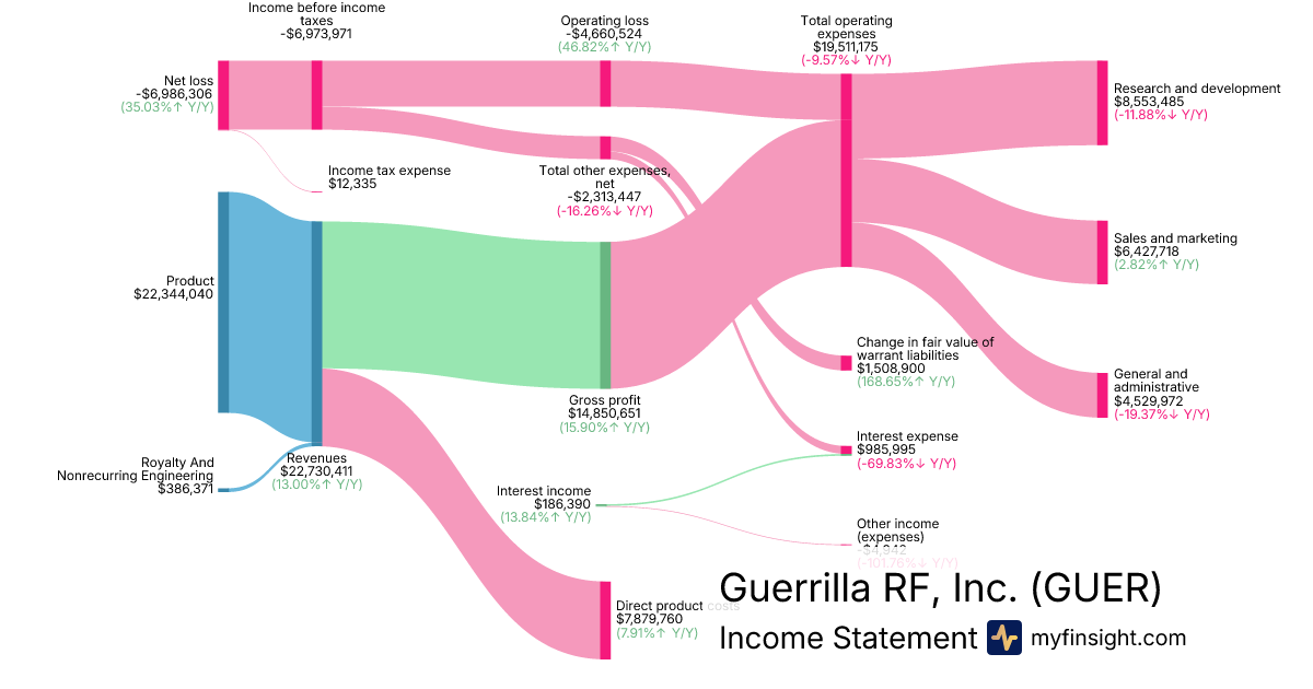 For the year ending 2025-12-31, GUER made $22,730,411 in revenue. -$6,986,306 in net income. Net profit margin of -30.74%.