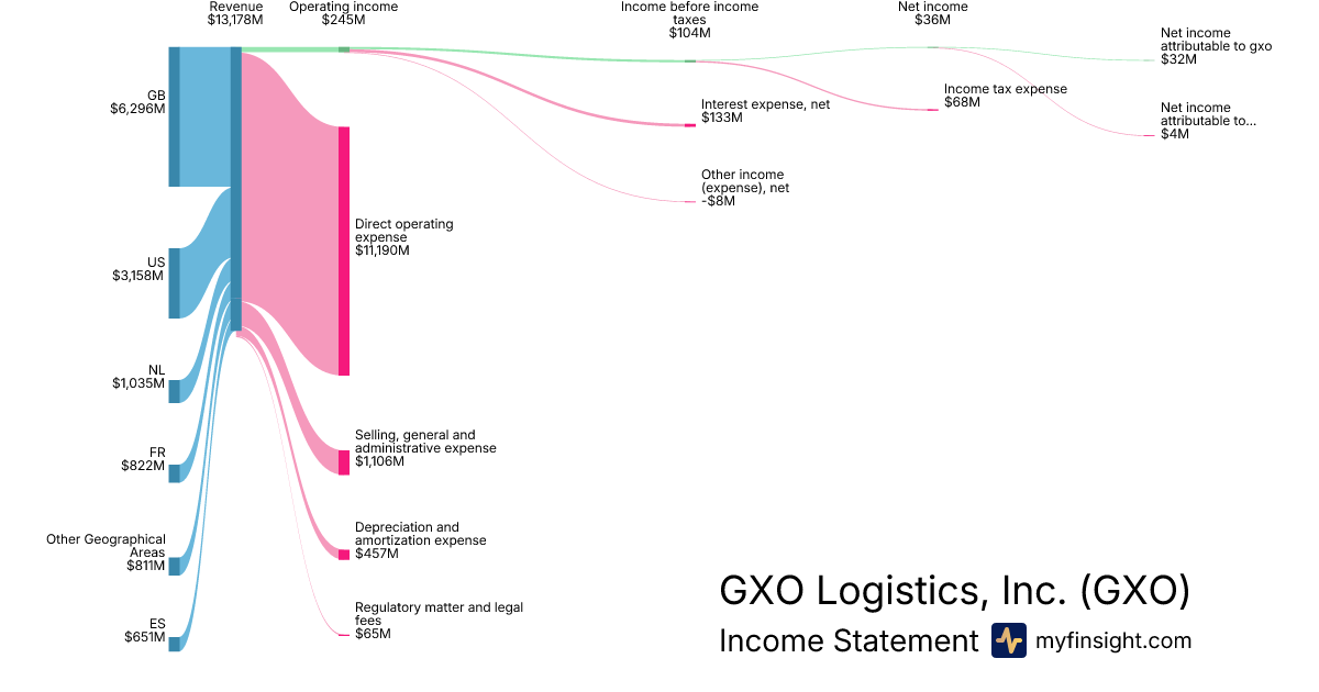For the year ending 2025-12-31, GXO made $13,178M in revenue. $32M in net income. Net profit margin of 0.24%.