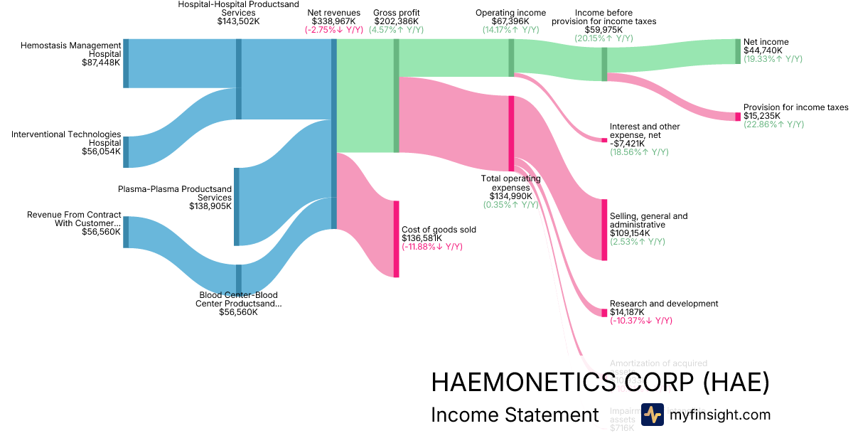 For the quarter ending 2025-12-27, HAE made $338,967K in revenue. $44,740K in net income. Net profit margin of 13.20%.