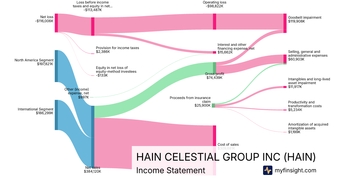 For the quarter ending 2025-12-31, HAIN made $384,120K in revenue. -$116,006K in net income. Net profit margin of -30.20%.