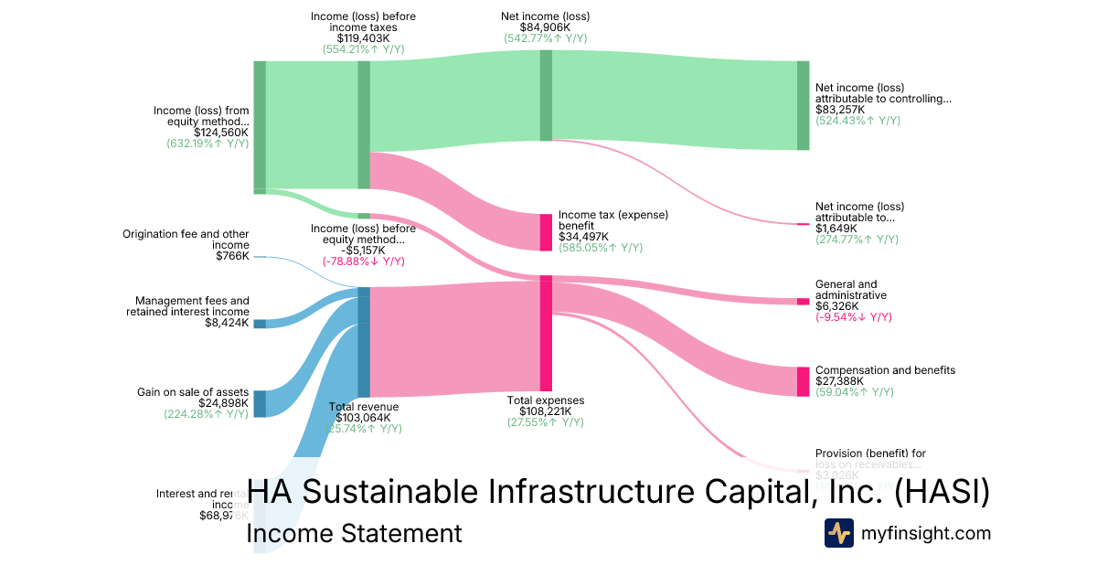 For the quarter ending 2025-09-30, HASI made $103,064K in revenue. $83,257K in net income. Net profit margin of 80.78%.