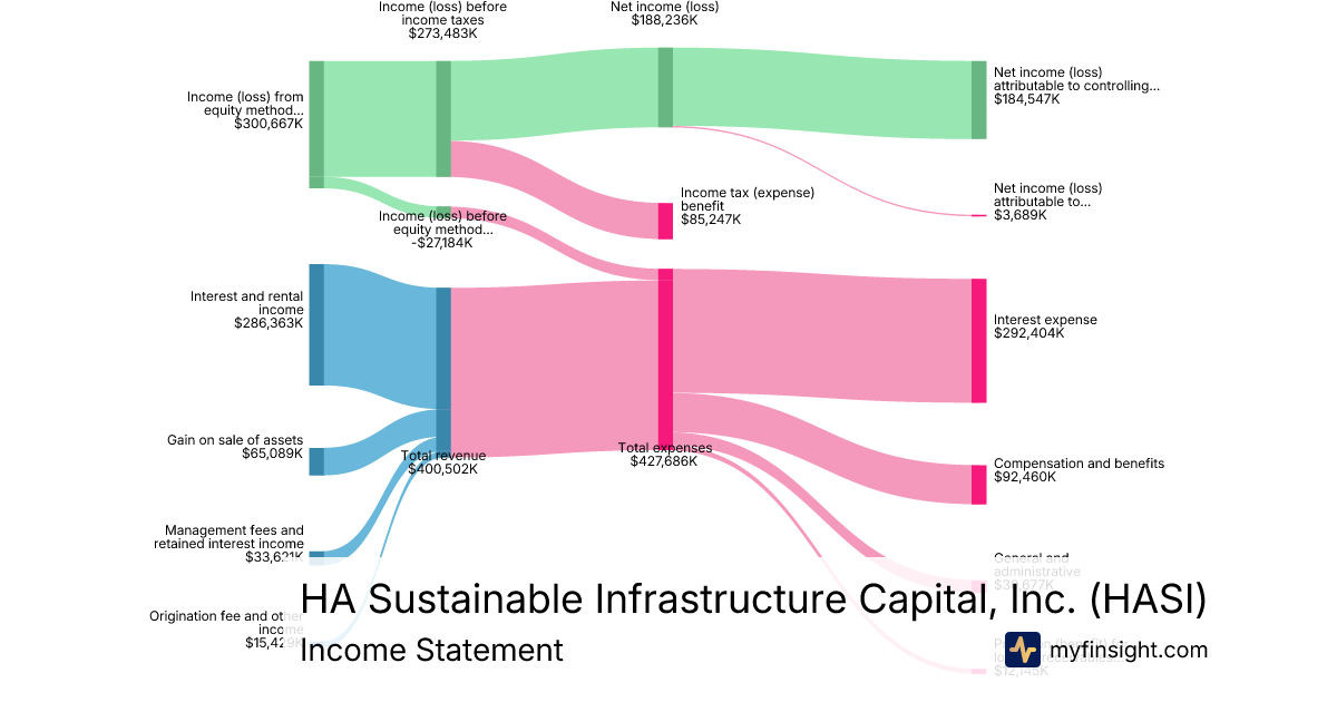 For the year ending 2025-12-31, HASI made $400,502K in revenue. $184,547K in net income. Net profit margin of 46.08%.