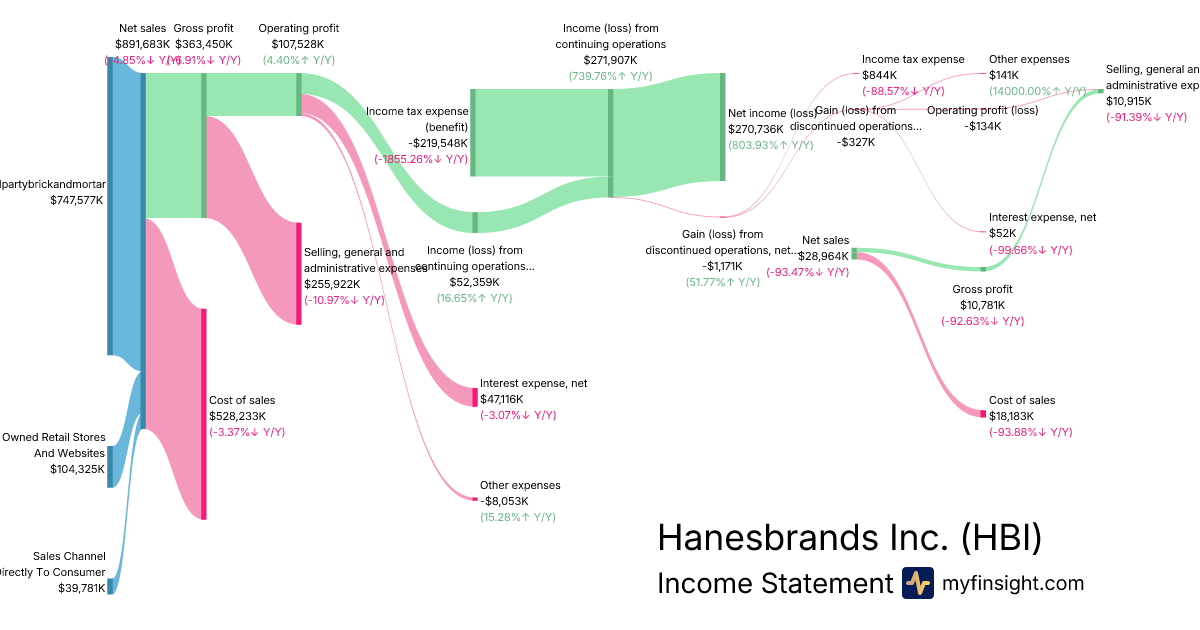 For the quarter ending 2025-09-27, HBI made $891,683K in revenue. $270,736K in net income. Net profit margin of 30.36%.