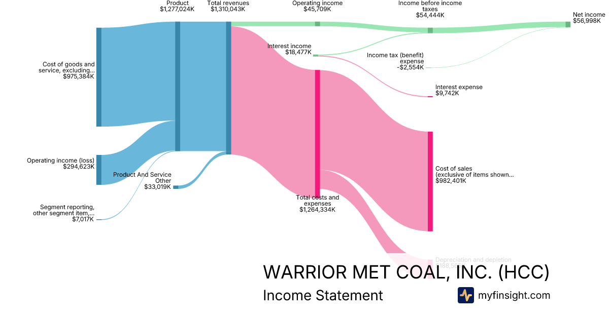 For the year ending 2025-12-31, HCC made $1,310,043K in revenue. $56,998K in net income. Net profit margin of 4.35%.