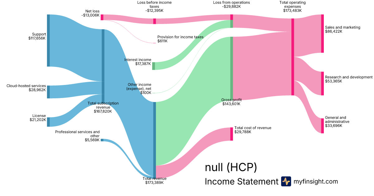 For the quarter ending 2024-10-31, HCP made $173,389K in revenue. -$13,006K in net income. Net profit margin of -7.50%.