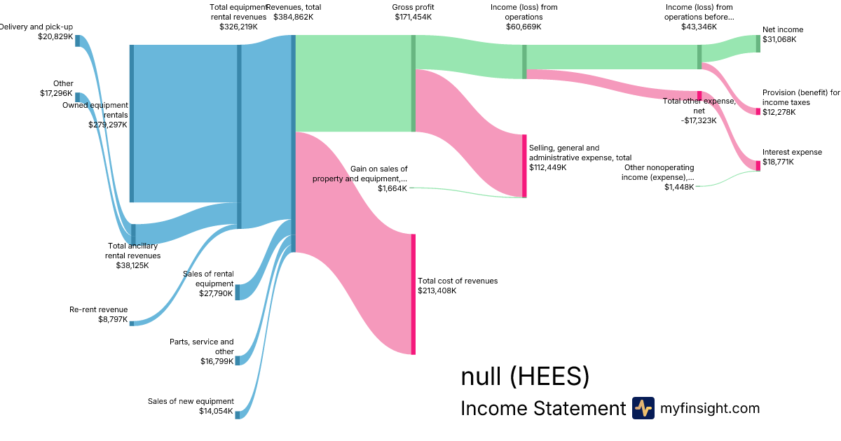 For the quarter ending 2024-09-30, HEES made $384,862K in revenue. $31,068K in net income. Net profit margin of 8.07%.