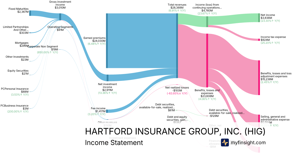 For the year ending 2025-12-31, HIG made $28,368M in revenue. $3,836M in net income. Net profit margin of 13.52%.