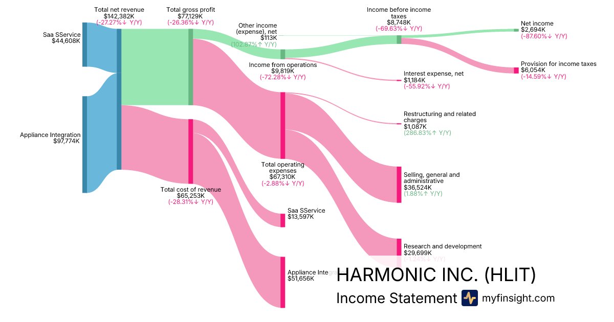 For the quarter ending 2025-09-26, HLIT made $142,382K in revenue. $2,694K in net income. Net profit margin of 1.89%.
