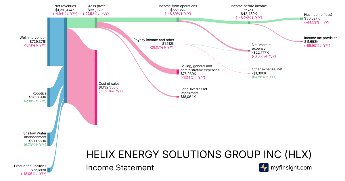 For the year ending 2025-12-31, HLX made $1,291,474K in revenue. $30,827K in net income. Net profit margin of 2.39%.