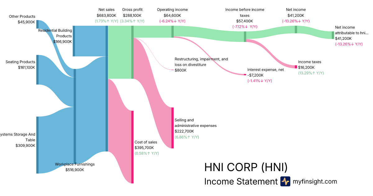 For the quarter ending 2025-09-27, HNI made $683,800K in revenue. $41,200K in net income. Net profit margin of 6.03%.