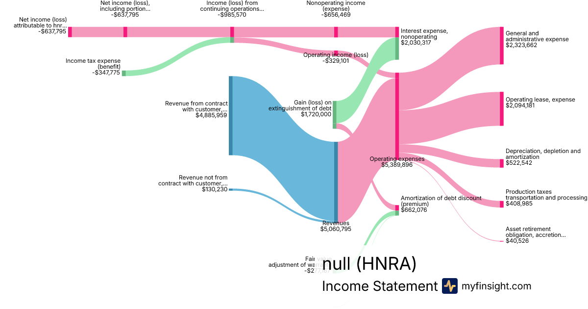 For the quarter ending 2024-06-30, HNRA made $5,060,795 in revenue. -$637,795 in net income. Net profit margin of -12.60%.