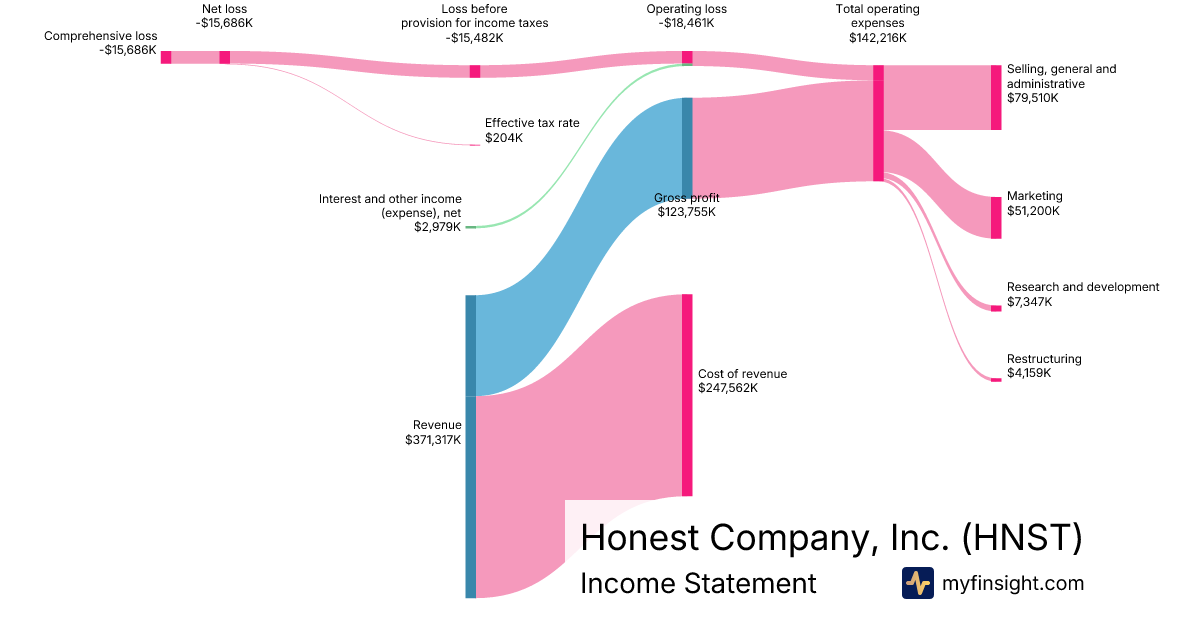 For the year ending 2025-12-31, HNST made $371,317K in revenue. -$15,686K in net income. Net profit margin of -4.22%.