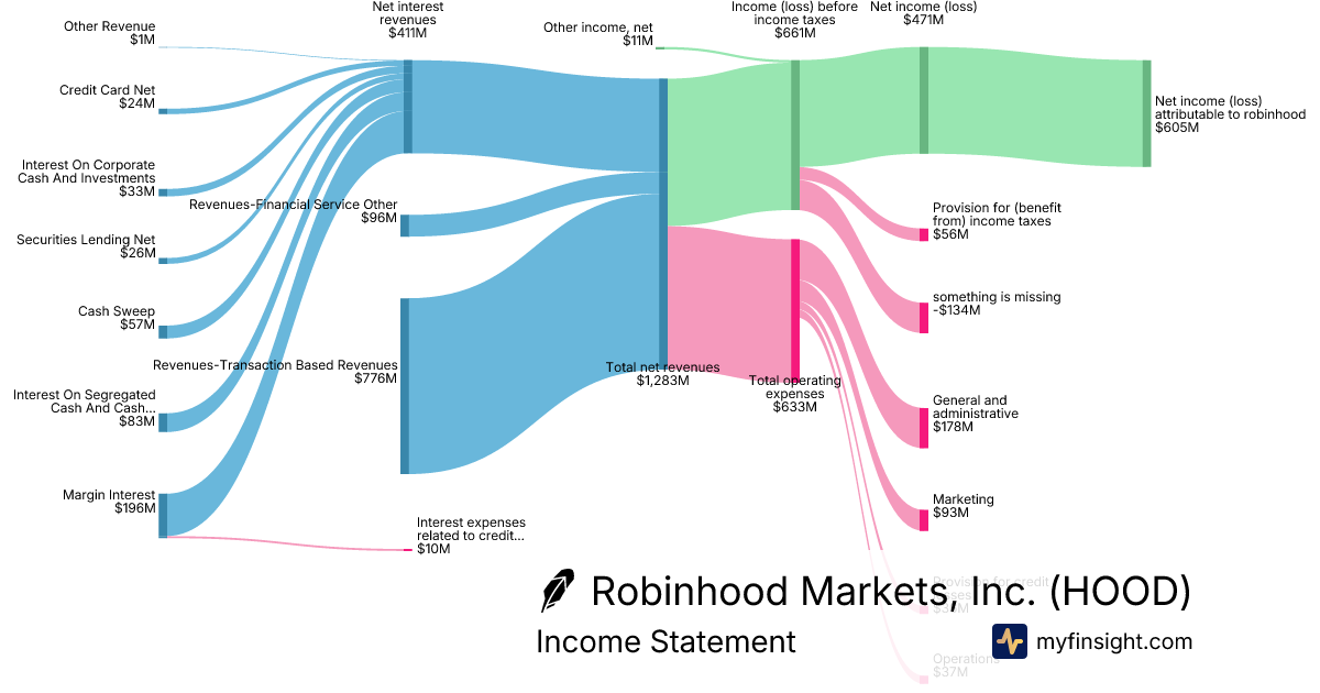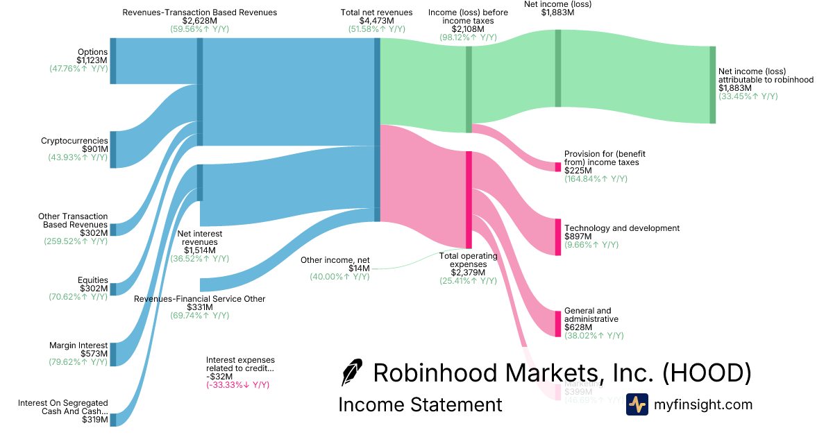 For the year ending 2025-12-31, HOOD made $4,473M in revenue. $1,883M in net income. Net profit margin of 42.10%.